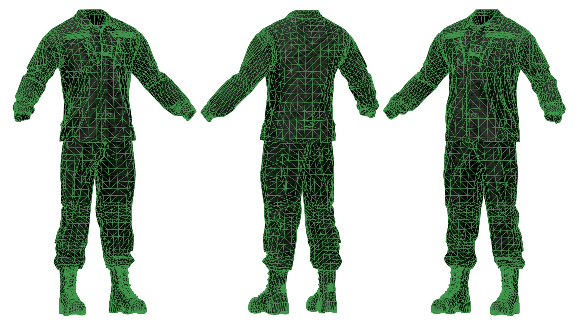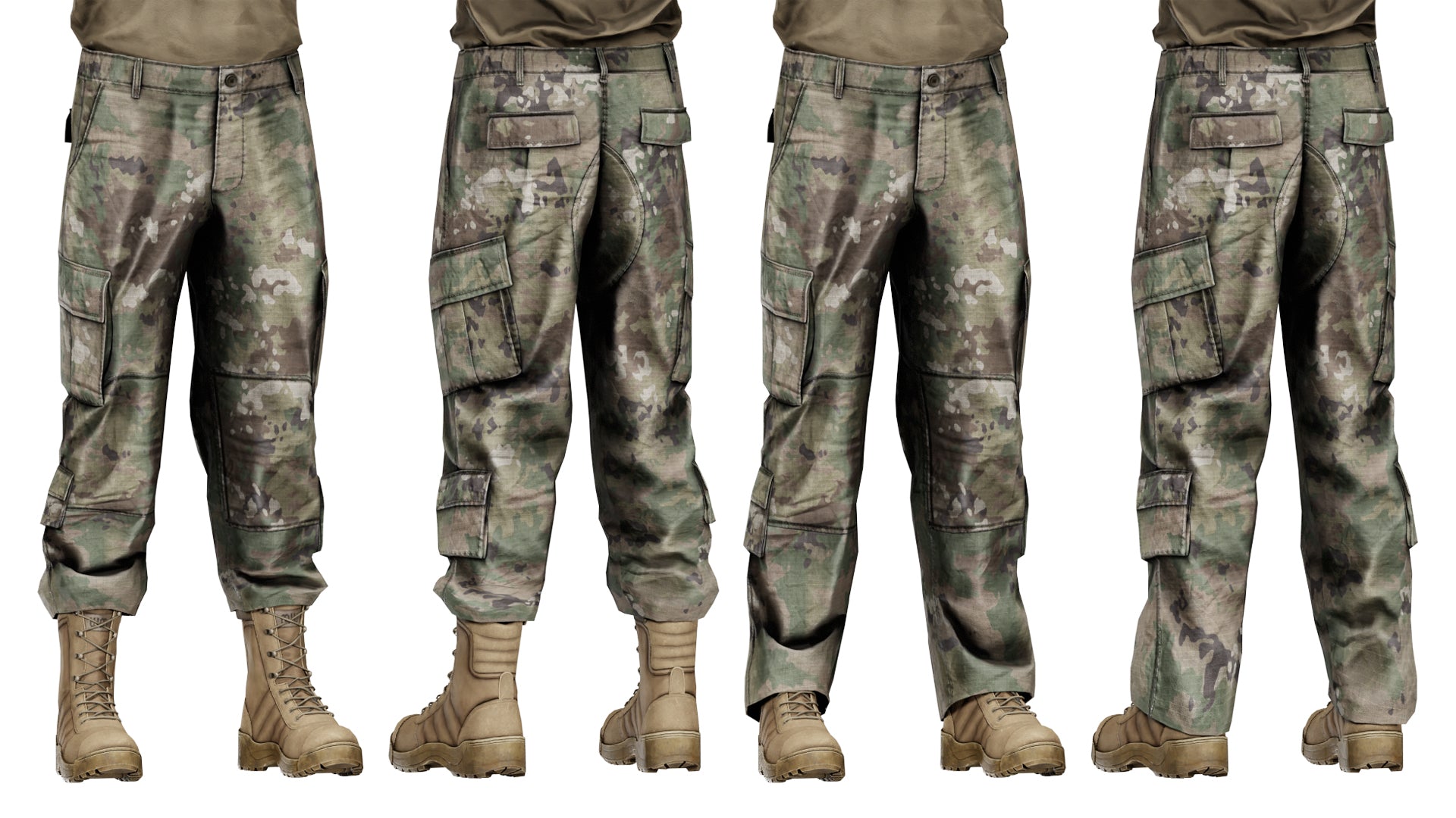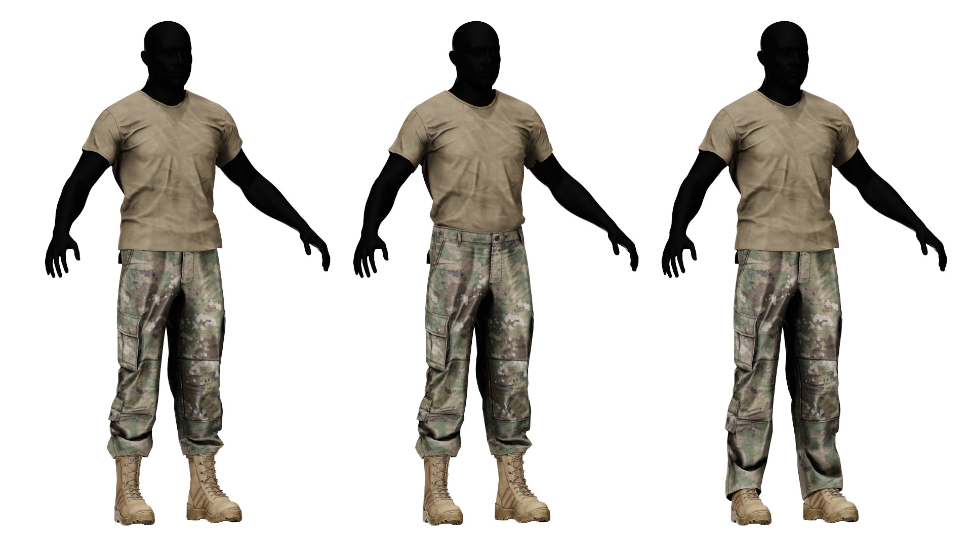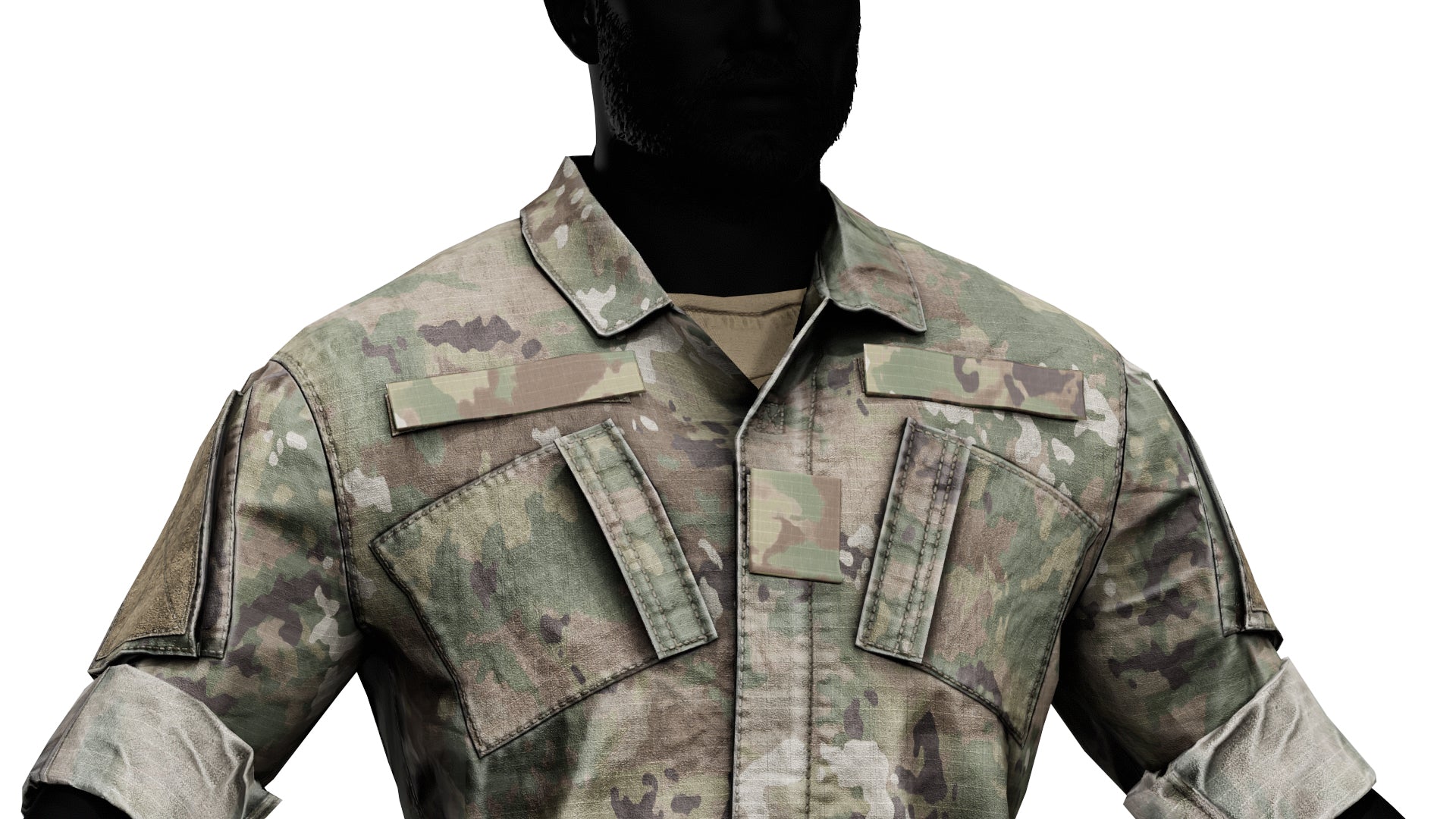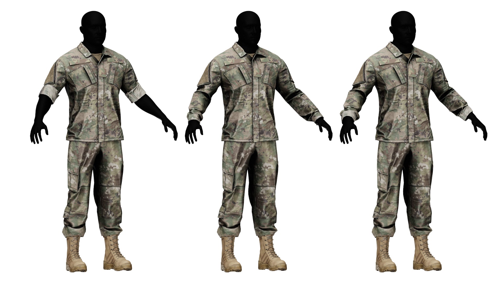 Game-Ready 3D Model inspired by the Army Combat Uniform (ACU). It comes in OCP camo (similar to Multicam) and Gray colors. ID and Stitch masks are also included for easy retexturing.We created several variants for a more modular experience — three jacket variations with different rolled-sleeve lengths, bloused and unbloused pants, as well as tucked-in and untucked shirts. The tactical boots are also included, available in both tan and black.Additionally, we created rank, name, and U.S. Army tabs you can use to further customize your characters. You can also easily hide them to display the Velcro underneath.