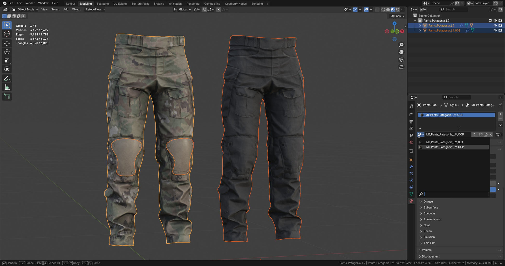 Game-Ready 3D Model inspired by Patagonia's L9 Combat Pants. OCP (Similar to Multicam), Black and AOR1 colors are included, as well as Stitches and ID Masks for easy retexturing. Kneepads can be removed/hidden. You can find the L9 Field Jacket here: https://www.3dmilitaryassets.com/products/patagonia-field-jacket-l9?_pos=2&_sid=03dbe509d&_ss=r