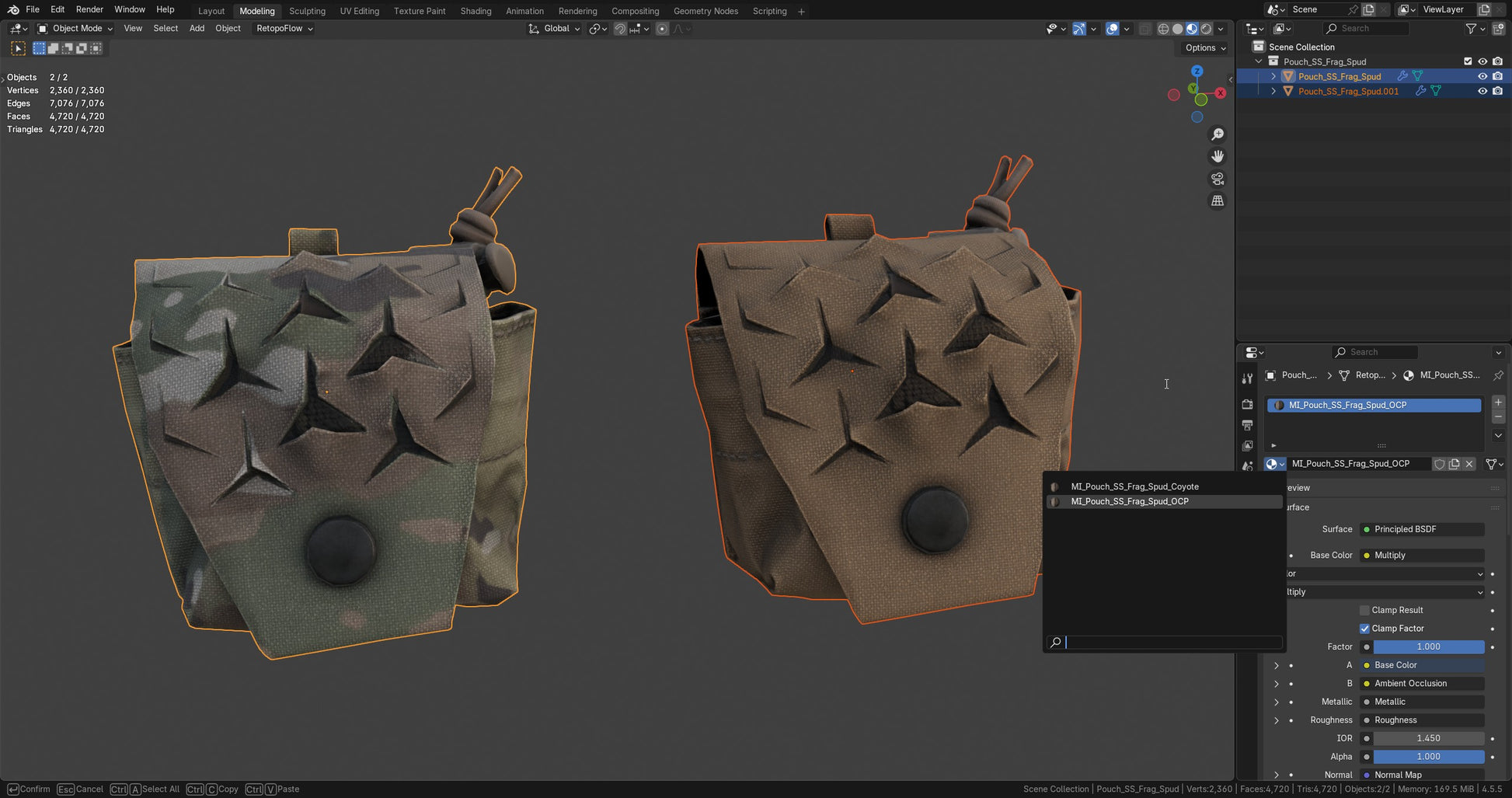 Game-Ready 3D Model inpired by the Frag Grenade SPUD Pouch made by Spiritus Systems. OCP (Similar to Multicam) and Coyote colors are included as well as Stitching and ID masks for easy retexturing.