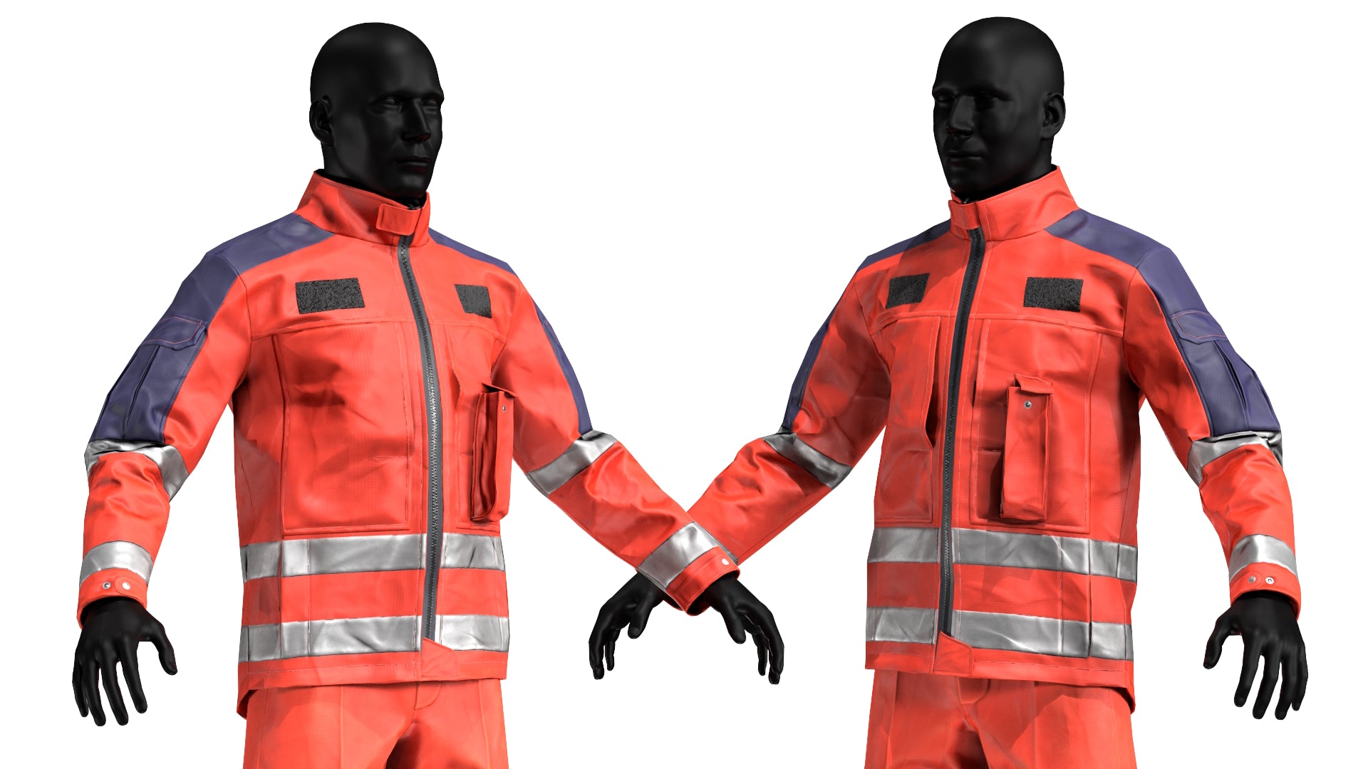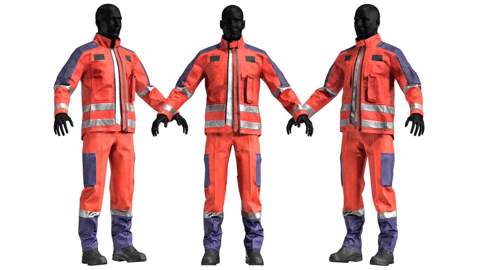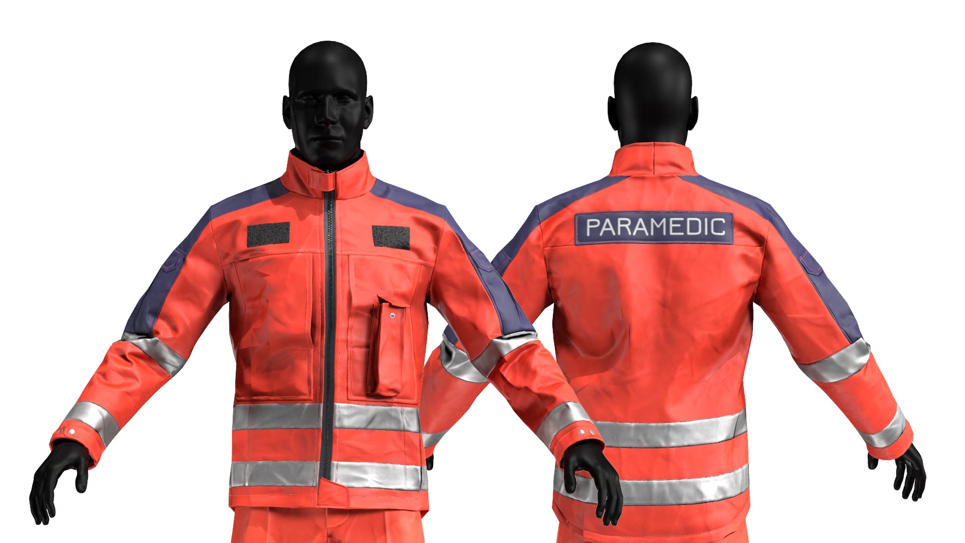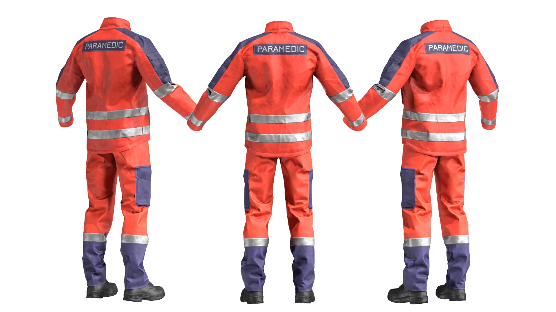 Game-Ready 3D Model inspired by various Emergency Medical Systems (EMS) uniforms. This product includes an EMS Jacket, Pants, and Boots, available in two different colors (orange and black). You can also find the jacket in two variants, one closed and one slightly open with a white shirt underneath.
