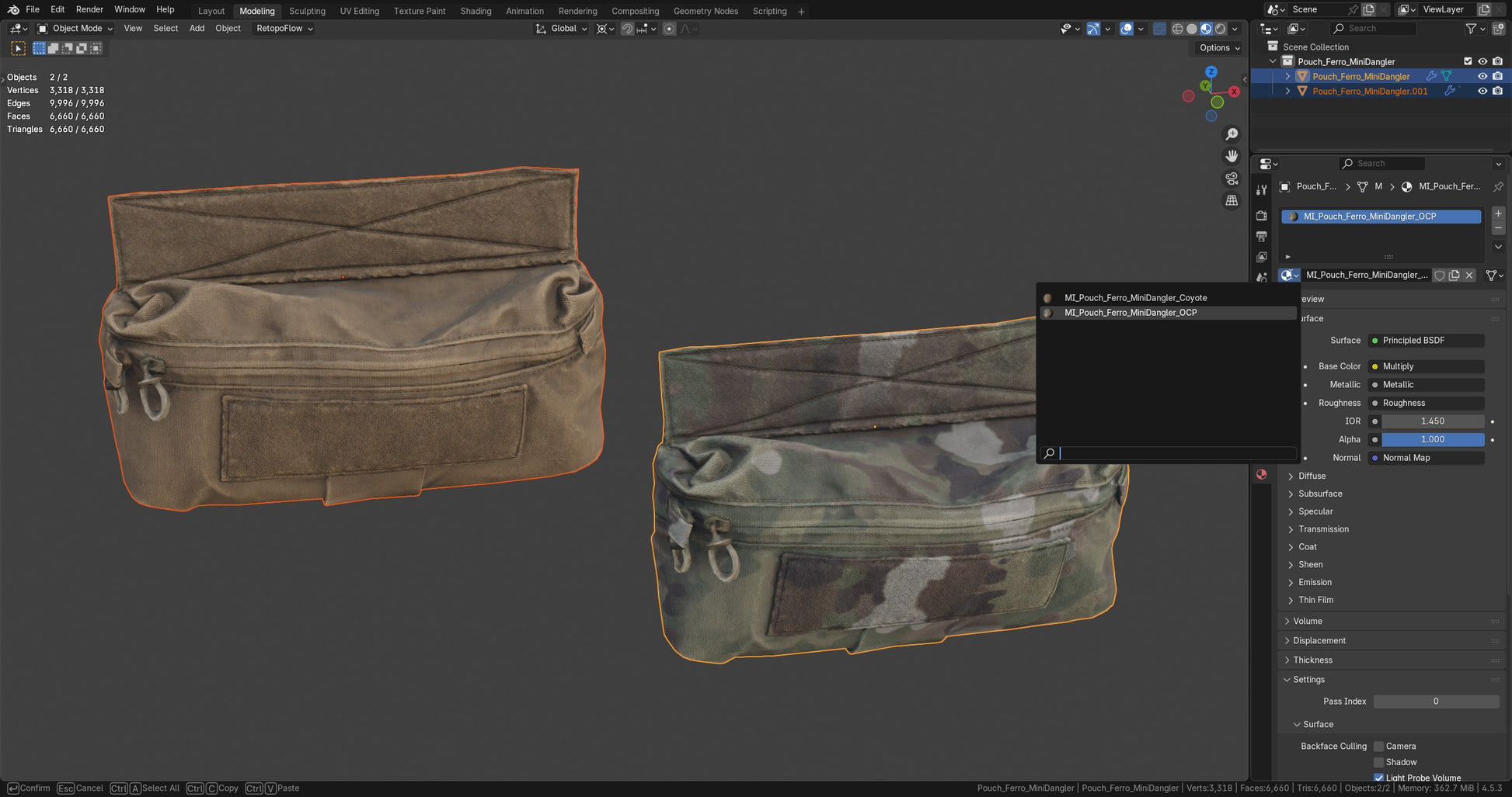 Game-Ready 3D Model inspired be The Mini Dangler drop pouch by Ferro Concepts. A lower profile version of the original Dangler Pouch. OCP (Similar to Multicam) and Coyote textures are included as well as ID and Stitching masks for easy retexturing.