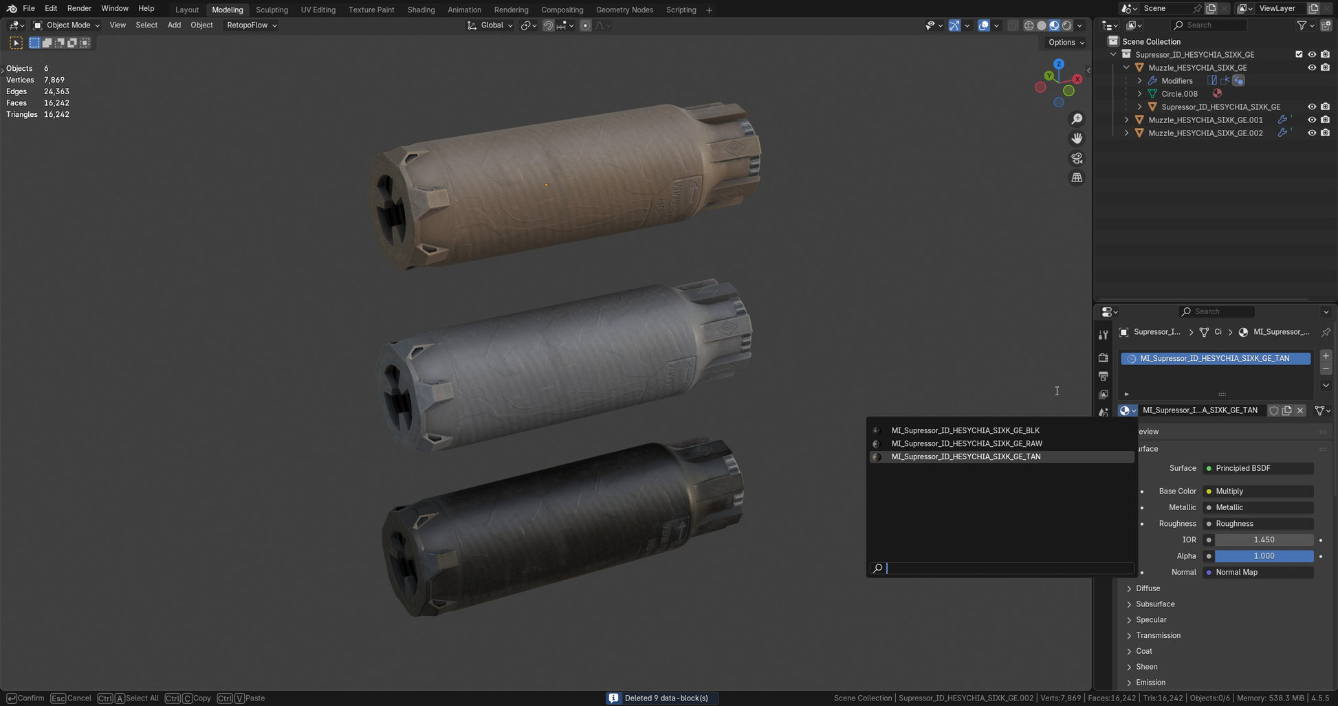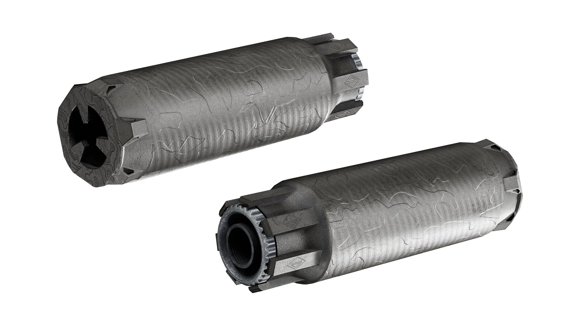 Game-Ready 3D Model inspired by the Irregular Defense Design Group HESYCHIA SIXK Supressor - Genesis Edition. Muzzle is also included as well as Black, Tan and Raw textures. Ideal for 5.56 and 6 ARC rifles.