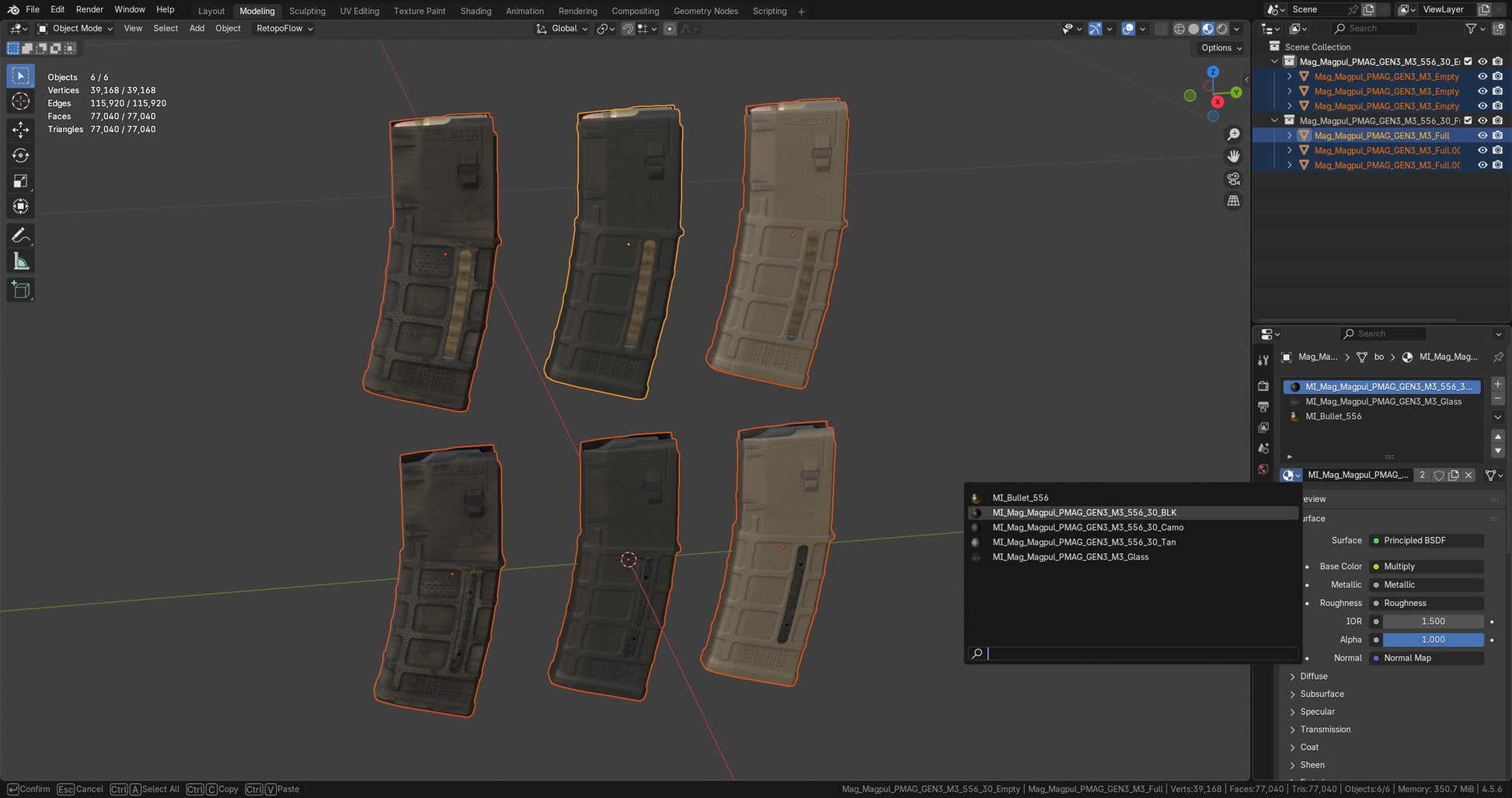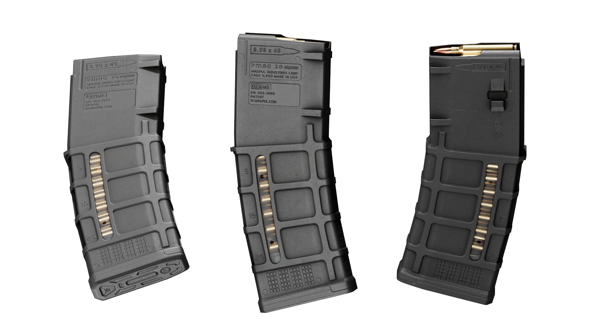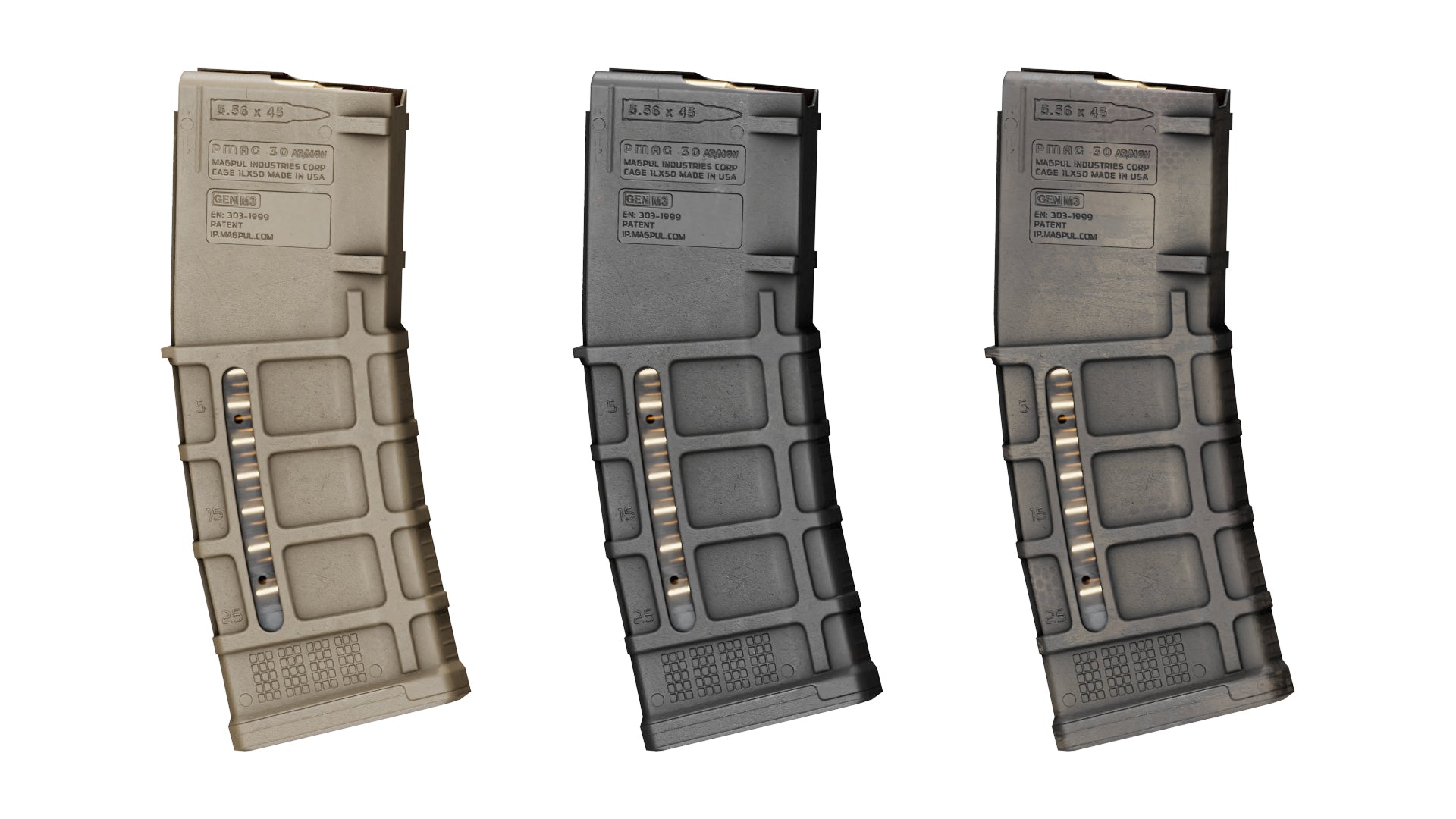 Game-Ready 3D Model inspired by Magpul's 30 Round 5.56x45 PMAG GEN M3 magazine for AR/M5 Rifles. Balck, Tan and Rattle Can camo paint colors are also included, as well as an empty and full variant.